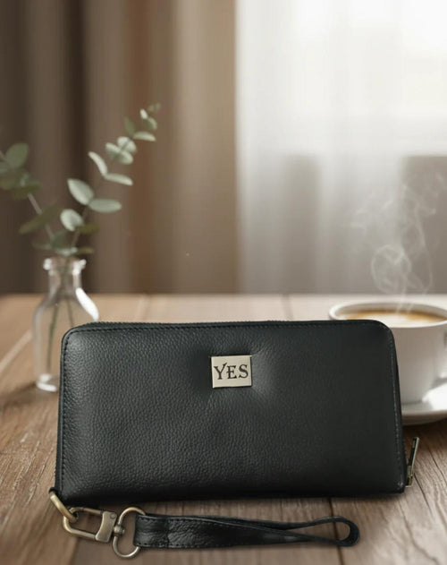 ATLAS Women’s Black Cow Leather Zip Wallet – Metal Logo, Premium Quality